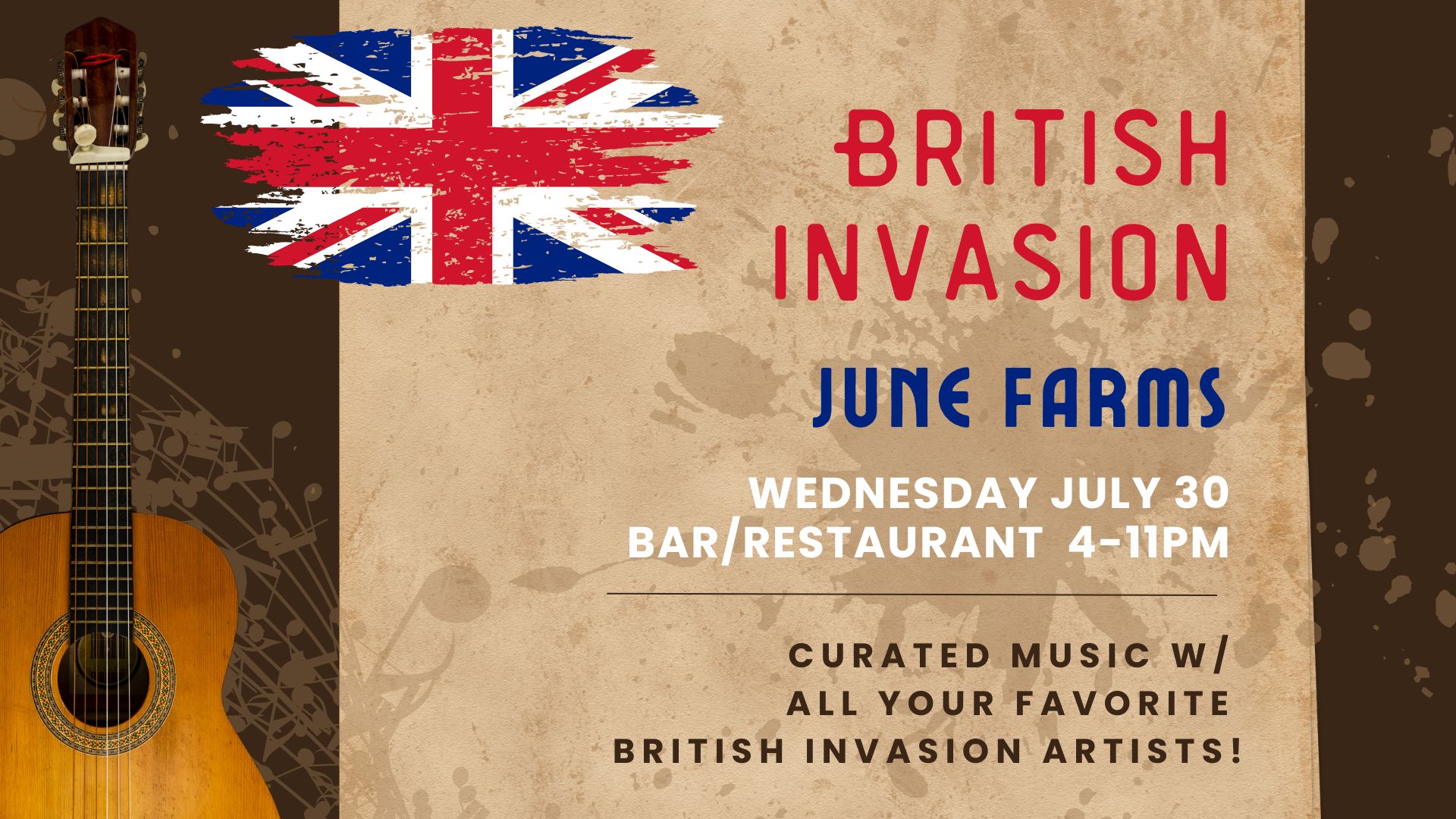 Join us at June Farms for a rockin’ evening celebrating the best of British music, food, and fun! Our British Invasion Night is the perfect midweek escape into the countryside—complete with great vibes, delicious eats, and your favorite tunes from across the pond.