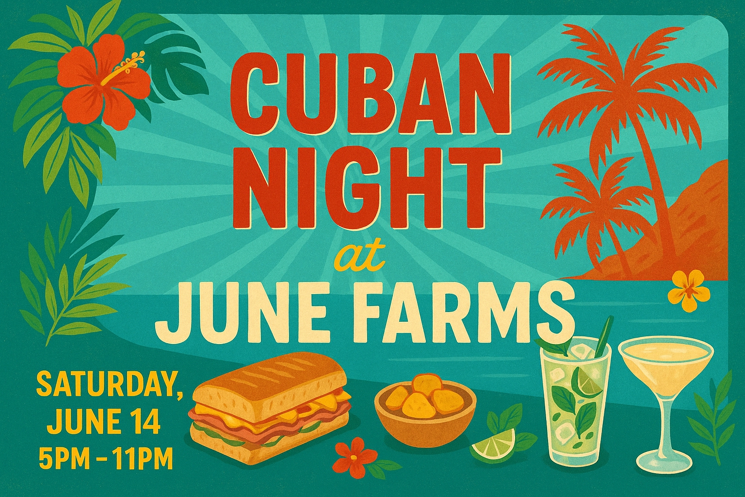 Join us for an unforgettable Cuban Night filled with tropical vibes, delicious Cuban-inspired food, handcrafted cocktails, and the infectious rhythm of Havana-style music. Dance under the stars, sip on fresh mojitos, and savor mouthwatering dishes like Cuban sandwiches, ropa vieja, tostones, and more β€” all while surrounded by the beautiful countryside of June Farms.