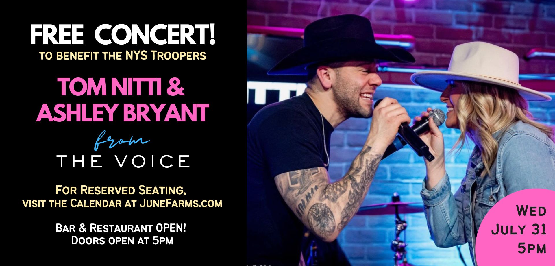 June Farms is THRILLED to invite country stars Tom Nitti & Ashley Bryant (from The Voice) to the farm for a FREE BENEFIT CONCERT on Wednesday, July 31!